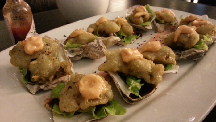 and so we did. the place was half full when we arrived. impressed with the mix of cooking styles and ingredients but our choices that night had us at bagnet. we ordered kare kareng bagnet with bagoong rice, tempura oysters with wasabi and something (basically three of our favorite things in one dish; awesome), sinigang na salmon ulo sa miso and bayabas, and their home-brewed iced tea. also ordered the tablea cheesecake, which was available that night, and the turon with ice cream.