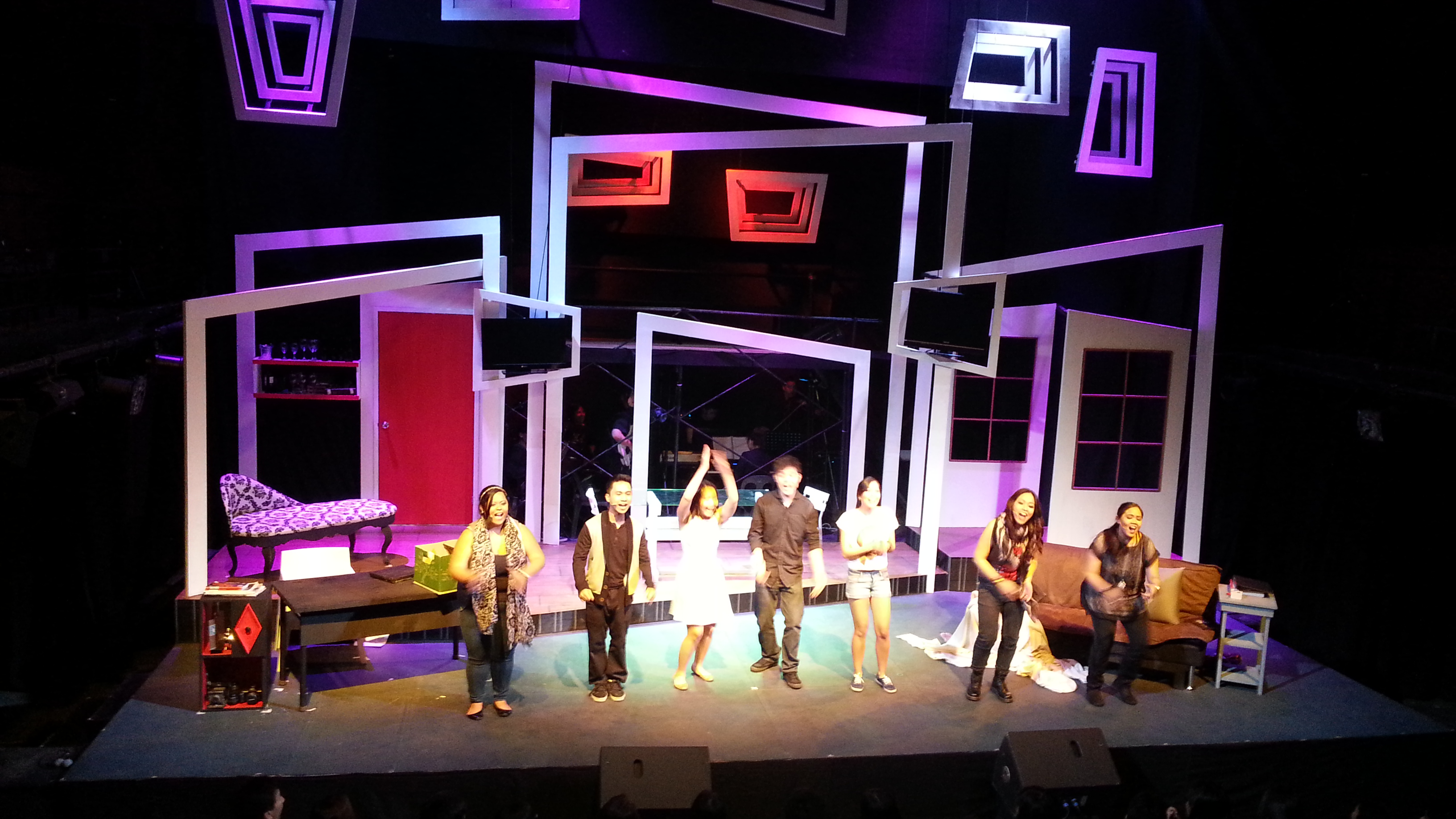 the cast during curtain call. from left: hans dimayuga, cassie manalastas, laura cabochan, fred lo, justine pena, mikou david, and abi sulit.