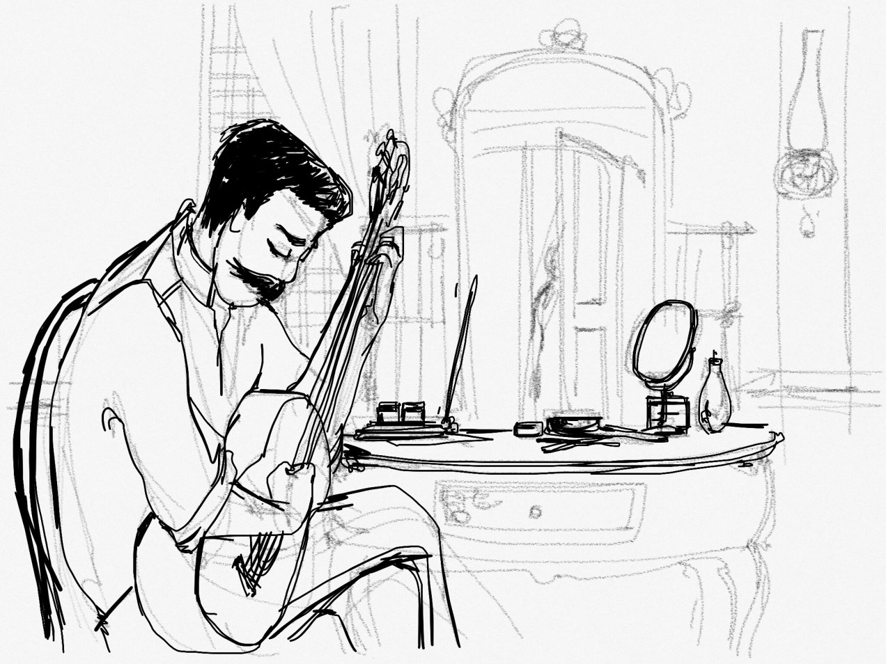 while doing research and working out the production design for the feature film, heneral luna, i got inspired by a scene from the script and decided to draw a sketch with antonio luna lost in thought playing his guitar and is about to be interrupted by his mother at the door. sketch is obviously unfinished but up to today i dont have the heart to finish it.